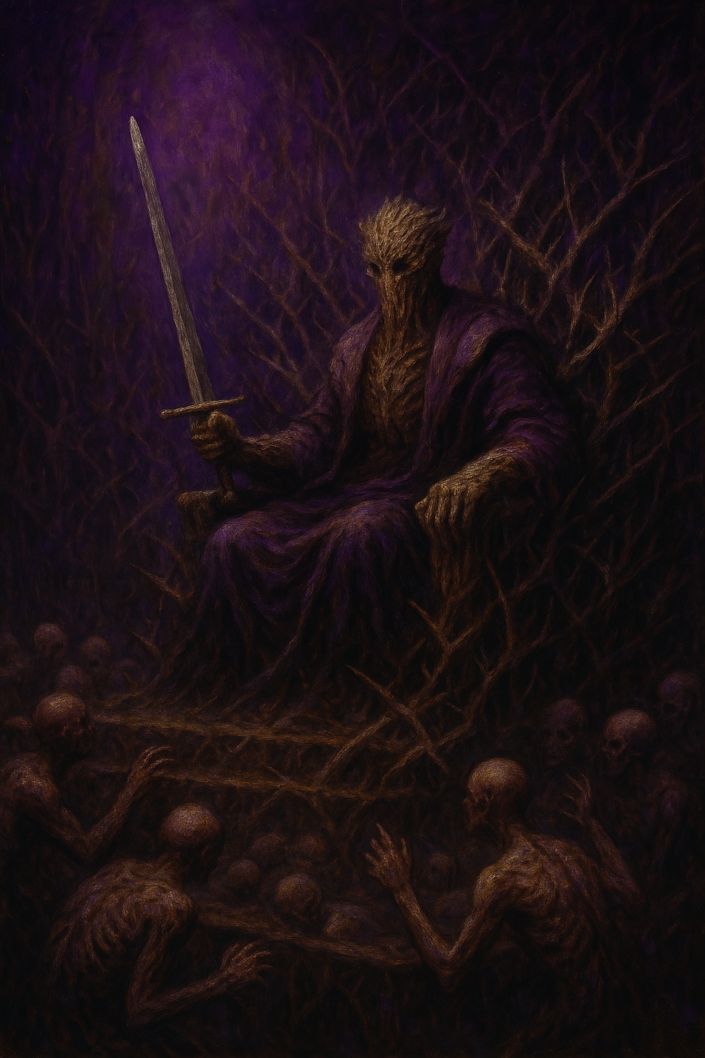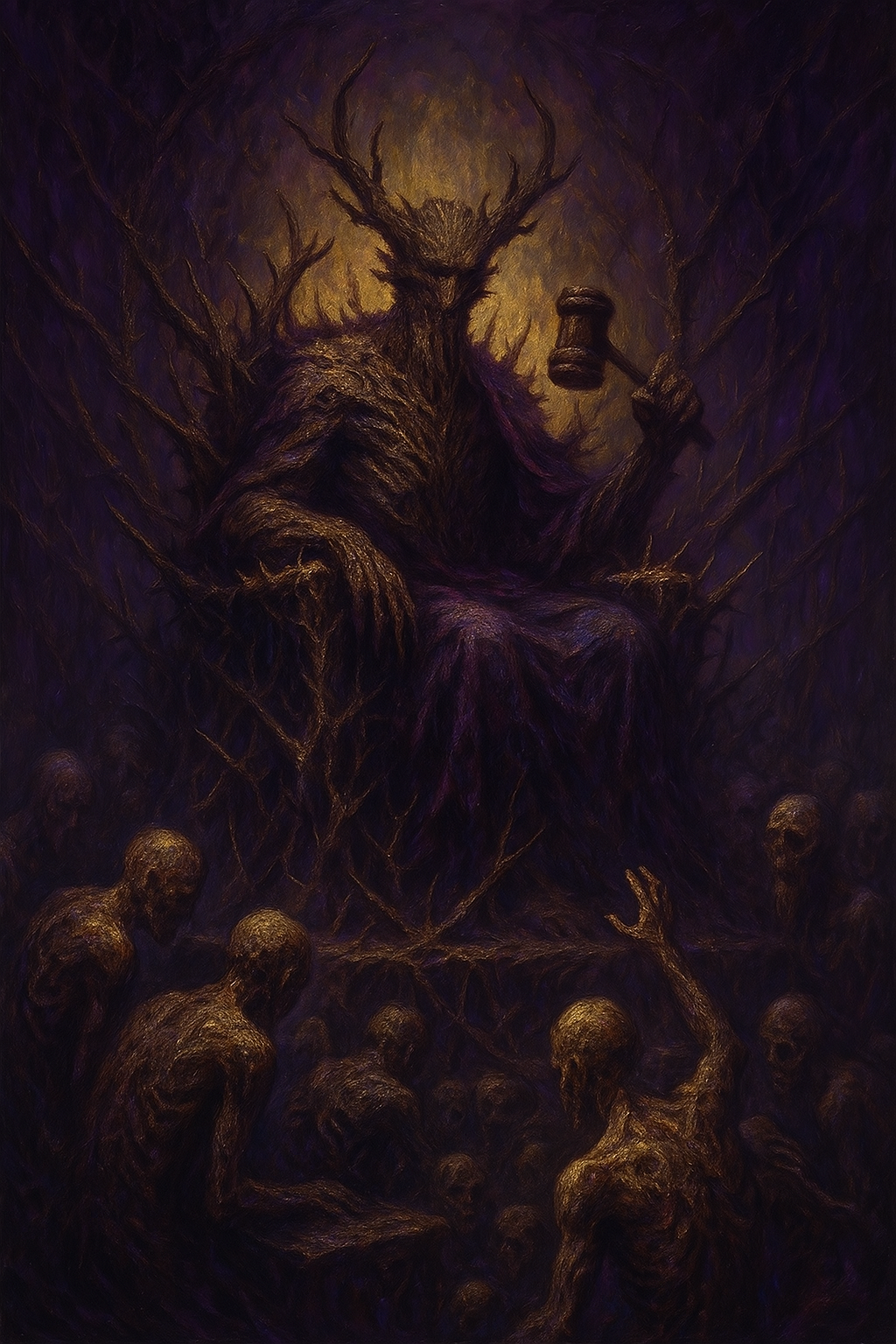 You hear their clamour before you see them—a rabble of gaunt, corpse-like figures, murmuring and groaning before the elevated thrones of two stately shapes. Lords with skin of bark—one wielding a gavel, the other motionless in stoic contemplation, one hand resting on the pommel of a grand executioner’s blade.